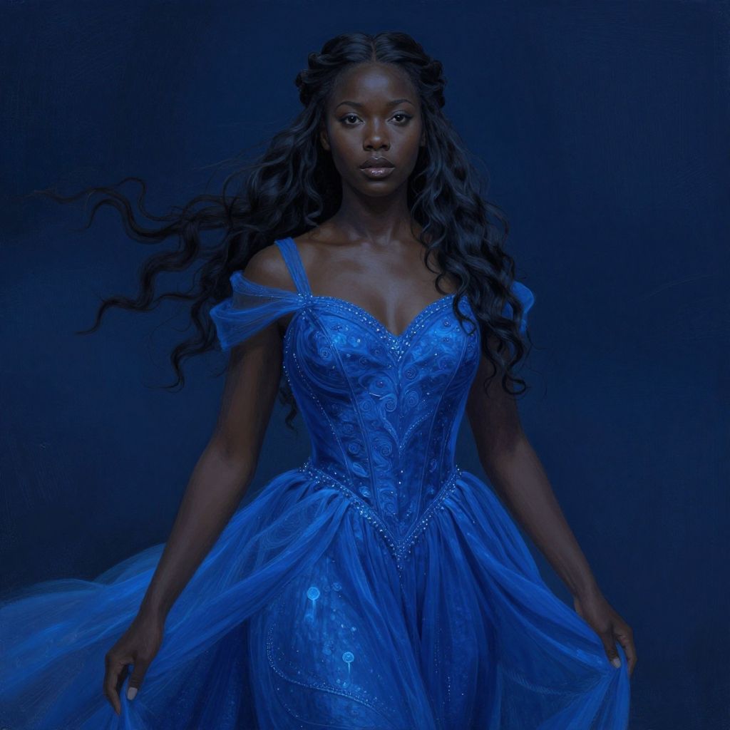 Photograph of a dark-skinned woman with long, wavy black hair against a deep blue background. She wears an elaborate, royal blue, off-the-shoulder ball gown with intricate beadwork and embroidery, accentuating her slender figure. The gown's skirt has layers of sheer, flowing fabric. Her expression is serious and composed, with subtle makeup highlighting her features. The lighting emphasizes the rich blue of the dress and her smooth, dark skin, creating a dramatic, ethereal effect. The background is solid and dark, keeping the focus on the woman and her striking attire.
