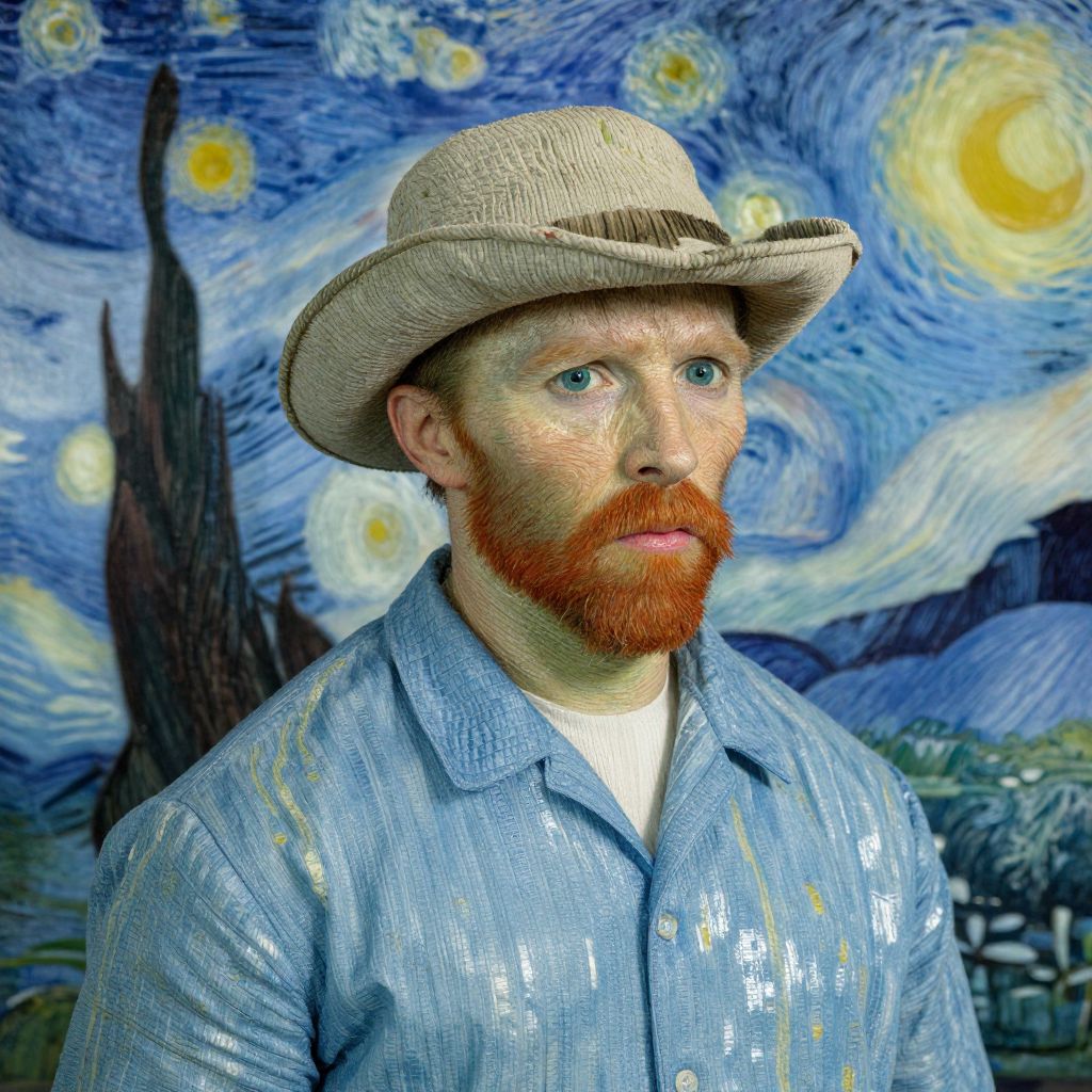 Digital artwork of a bearded man in a light blue shirt and beige hat, set against Vincent van Gogh's "Starry Night" background.