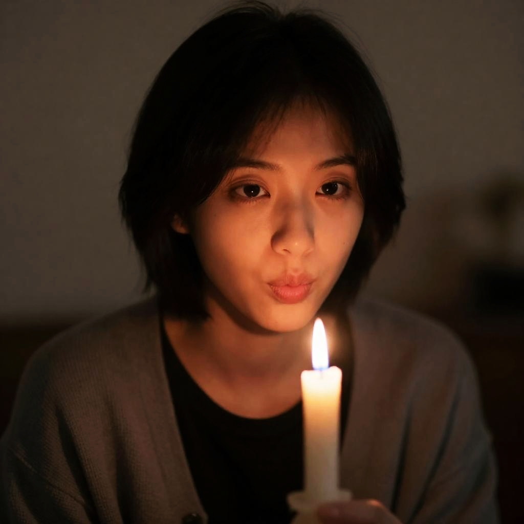 Woman with short black hair, gray cardigan, and black shirt, sucking on a lit candle with intense focus. Blurred warm background. Candle flame on right. Woman's eyes wide, lips slightly parted around candle. Dim lighting.