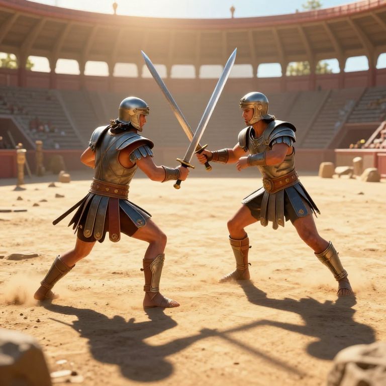 A high-definition 3D-rendered depiction of two gladiators engaged in a dramatic duel within a sunlit, floating arena, their shadows cast vividly on the sandy ground as they wield gleaming swords under golden-hour lighting.