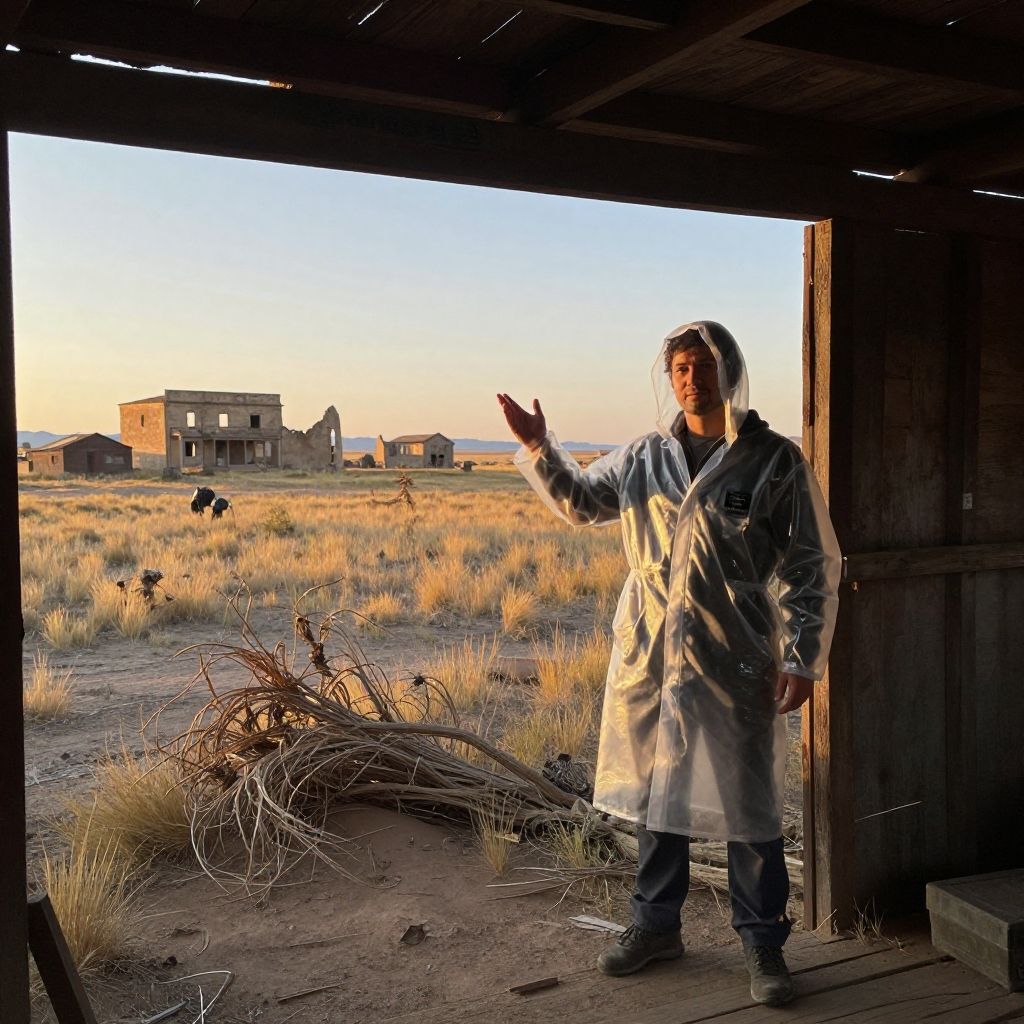 Photograph of a man in a white raincoat standing in a dilapidated wooden shed, gesturing towards a sunlit, abandoned desert town with