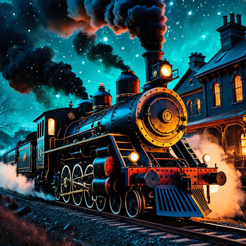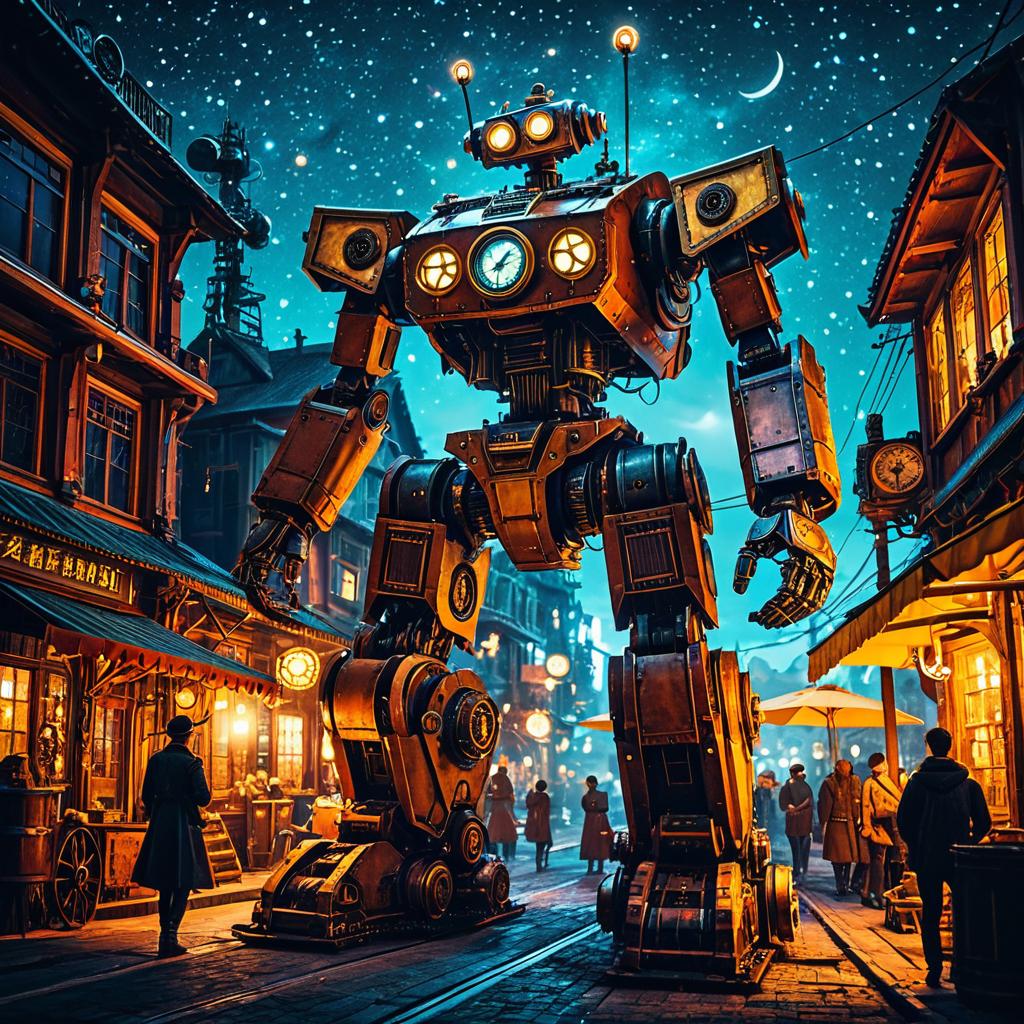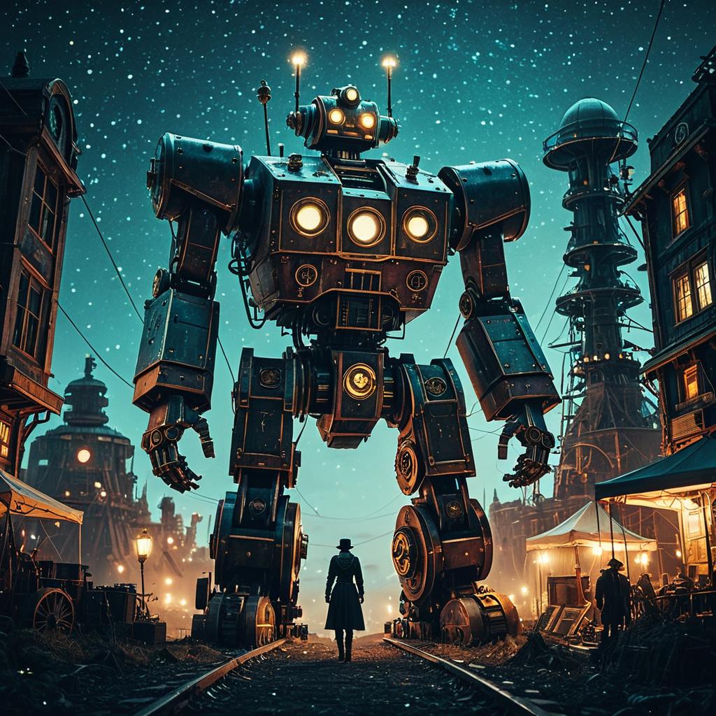 Night scene with stars, steampunk aesthetic, giant robot in background, mysterious mood, muted colors, fantasy setting, inspired by Beeple, HD, 4K, trending on ArtStation