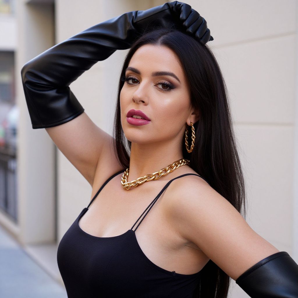 Photograph of a confident woman with long, straight dark hair, wearing a black spaghetti strap top and black, glossy elbow-length gloves. She's striking a pose with one hand on her head, showing off large gold hoop earrings and a chunky gold chain necklace. Her makeup is glamorous with bold lips. The background is an outdoor urban setting with a light-colored wall.