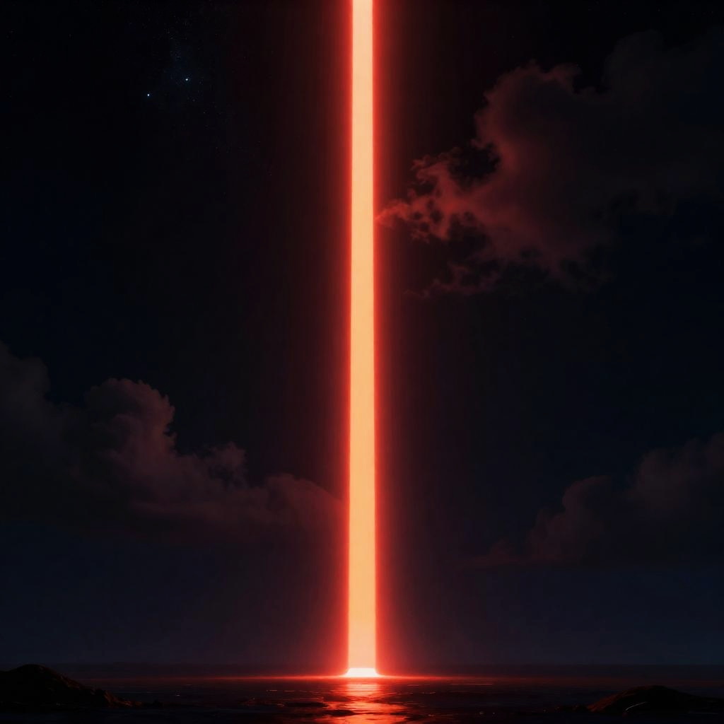 A futuristic cosmic scene featuring a powerful vertical neon beam of light glowing in vibrant red and orange colors, surrounded by dark clouds and a starry night sky, with a distant horizon and deep space ambiance