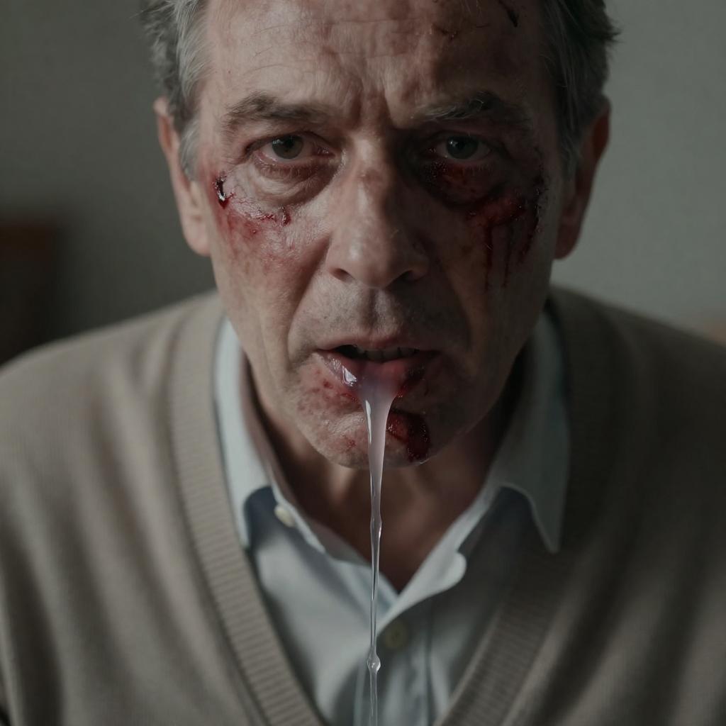 Close-up of an older Caucasian man with a bruised and bloody face, staring intensely forward. White liquid is pouring from his mouth. He is wearing a light brown cardigan over a collared shirt. The background is dark and indistinct.