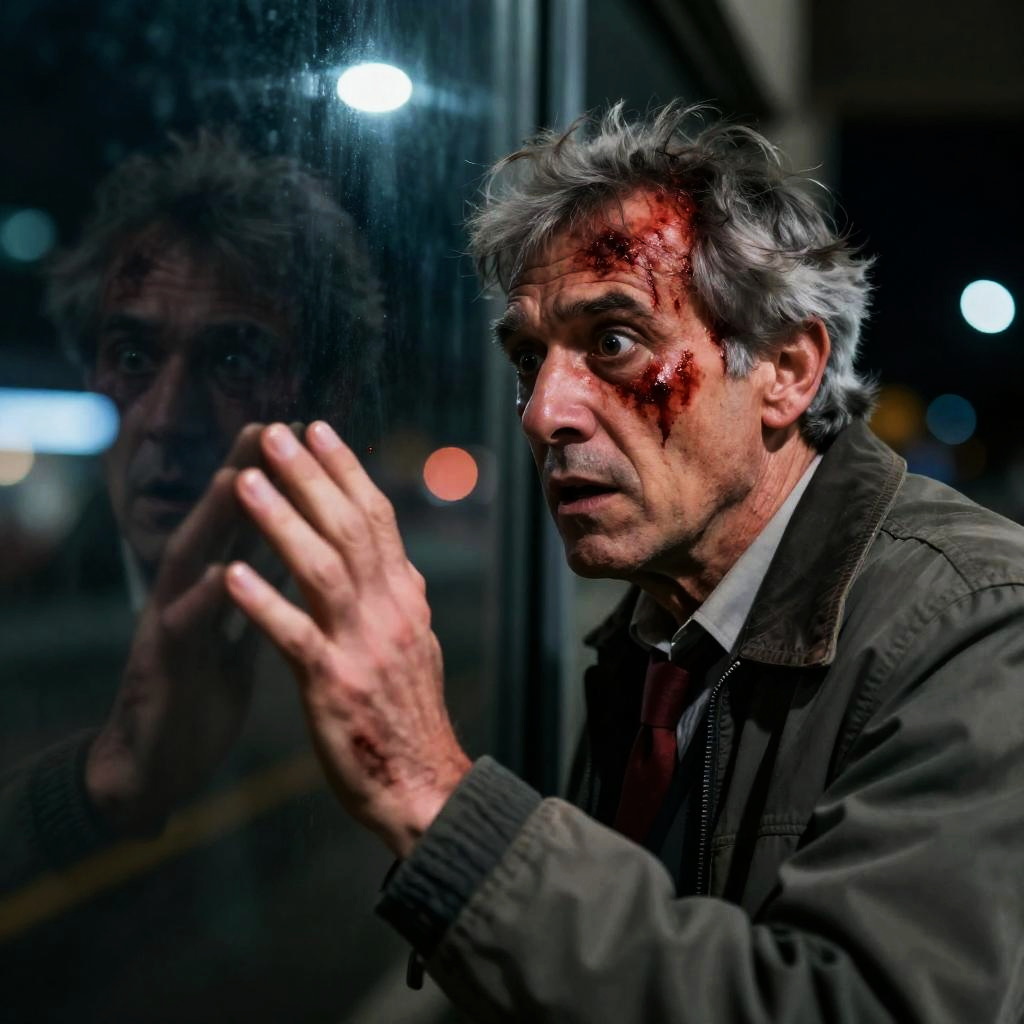 Close-up photograph of an older man with a bloody, bruised face, staring intensely forward. White liquid is pouring from his mouth. He has a light brown cardigan and a collared shirt. Dark, indistinct background.