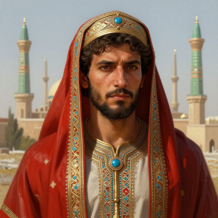 Photograph of a Middle Eastern man with dark curly hair and a full beard, wearing an ornate red robe with intricate gold and turquoise embroidery, and a matching headpiece with a turquoise gem. His expression is serious. In the background, there is a clear blue sky and a large, historic mosque with four green-topped minarets and beige stone walls. The mosque's architecture is detailed and traditional. The man's robe is richly textured, and the turquoise gem on his headpiece and chest piece are prominent. The setting suggests a historical or cultural context.