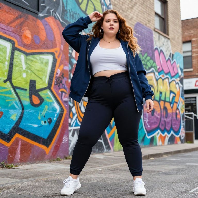 Plus size hourglass silhouette in dynamic urban streetwear, colorful graffiti walls, lively city vibe, bold confident pose, modern fashion editorial look with sharp contrast and vibrant colors
