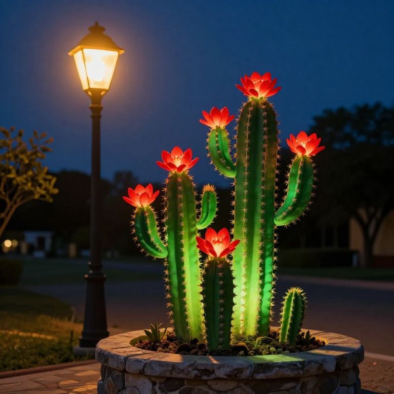 Glowing green cacti adorned with vibrant red flowers stand illuminated on a stone pedestal, casting a serene glow alongside a classic streetlamp that bathes the scene in warm yellow light against the backdrop of a tranquil nighttime landscape.