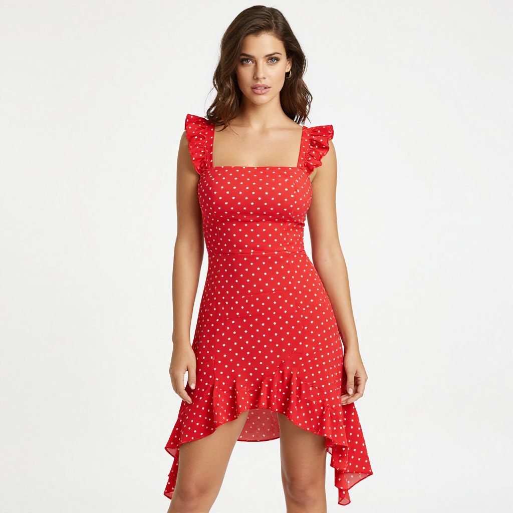 "Woman, playful summer style, ruffled red dress with polka dots, square neckline, sleeveless with ruffle details on the straps, asymmetrical ruffle hemline, knee-length at the front with a longer flowing back, plain white studio background.. Sexy. Pretty face and beаutiful eyes. Big breasts."