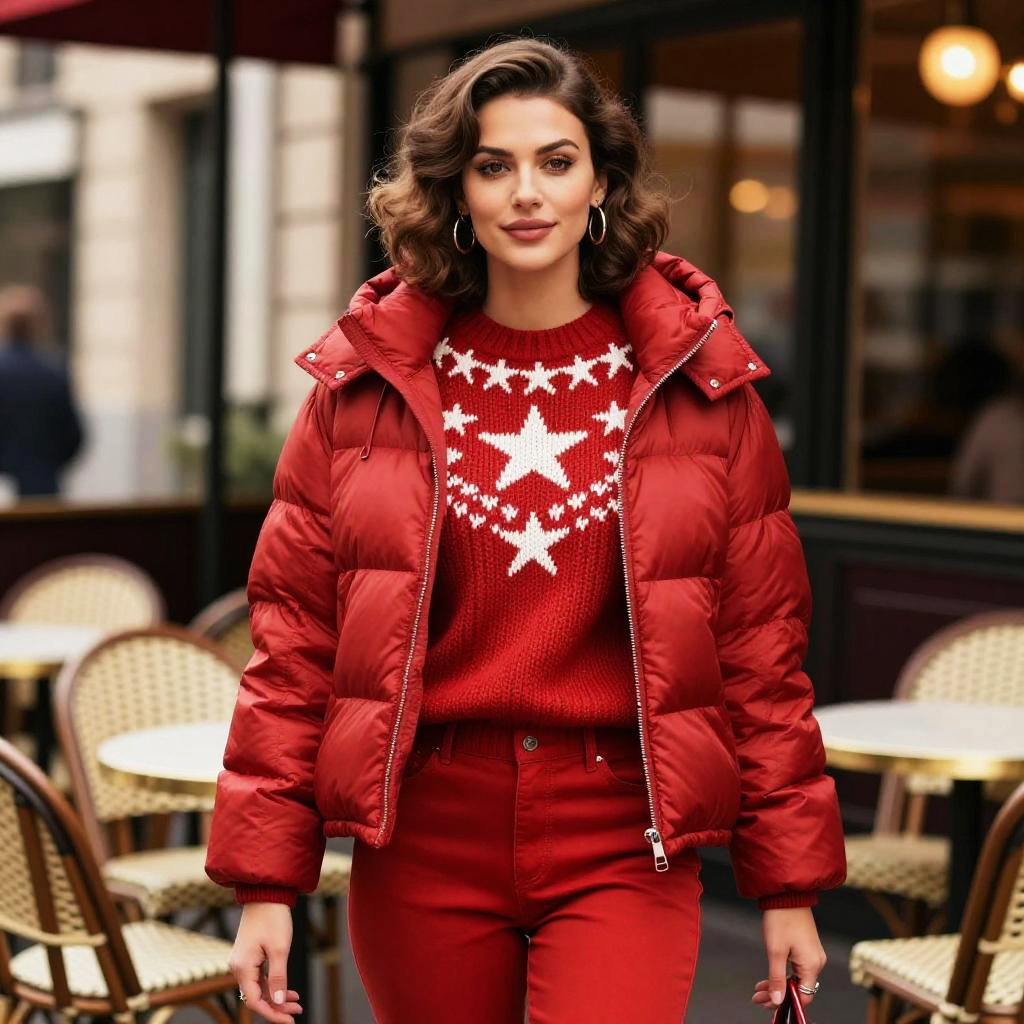A Pear-shaped body type woman in vibrant streetwear winter fashion, featuring a red puffer jacket with a hood, a chunky knit sweater with a white star pattern, and matching red pants, stands at a 1930s Parisian café terrace, capturing the essence of wit studio style. Sexy. Pretty face and beutiful eyes
