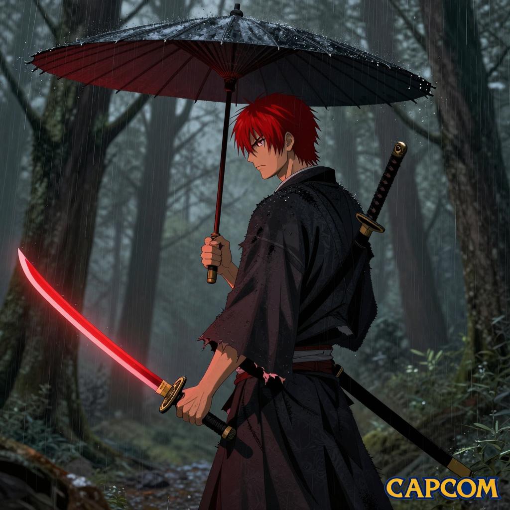 Illustration of a male samurai with red hair, wearing a tattered red kimono with floral patterns, standing by a pond. He holds a sword in his right hand and a katana in his left. Autumn leaves fall around him. The background has trees with orange leaves. Sunlight filters through the trees. His expression is intense. He is in a semi-profile stance.