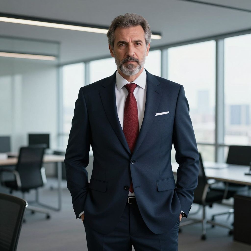 Photograph of a handsome, middle-aged man with light skin, dark brown hair, and a short, well-groomed beard and mustache. He has dark eyes and is wearing a dark navy blue suit with a white dress shirt and a black tie. He stands with his arms crossed, looking directly at the camera with a serious expression. The background is a modern office space with blurred fluorescent lights and large windows, and a few indistinct people are visible in the background. The lighting is bright, highlighting his facial features and suit.