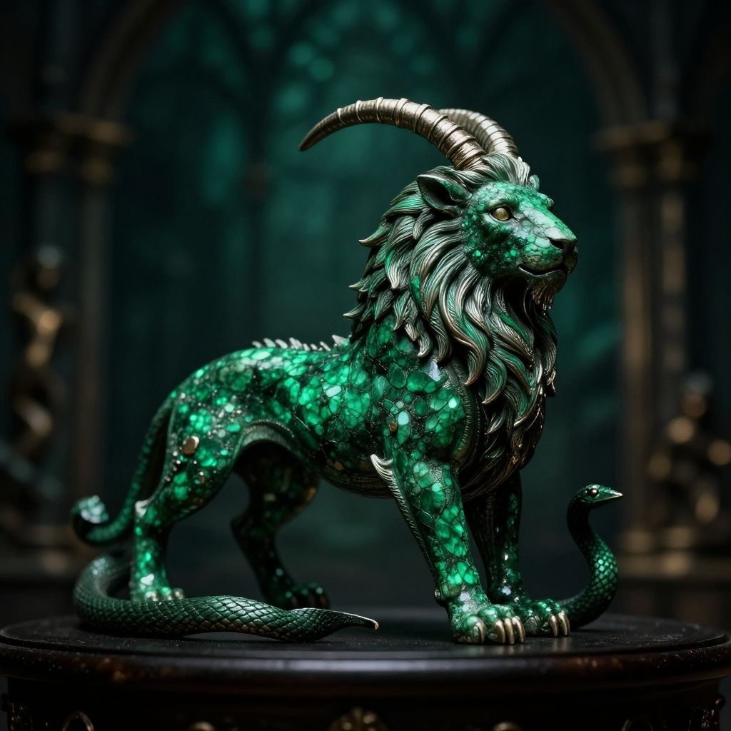 Picture of a jewelry in form of a Chimaera - Mythical creature with the body of a lion, the head of a goat, and a serpent's tail, representing chaos and destruction., intricate, high quality, exclusive, strange, creepy, horrorgorgeous backgroundmedieval, gothic, dark, vibrantRuby Green Cyancinematic film still . shallow depth of field, vignette, highly detailed, high budget, bokeh, cinemascope, moody, epic, gorgeous, film grain, grainy
