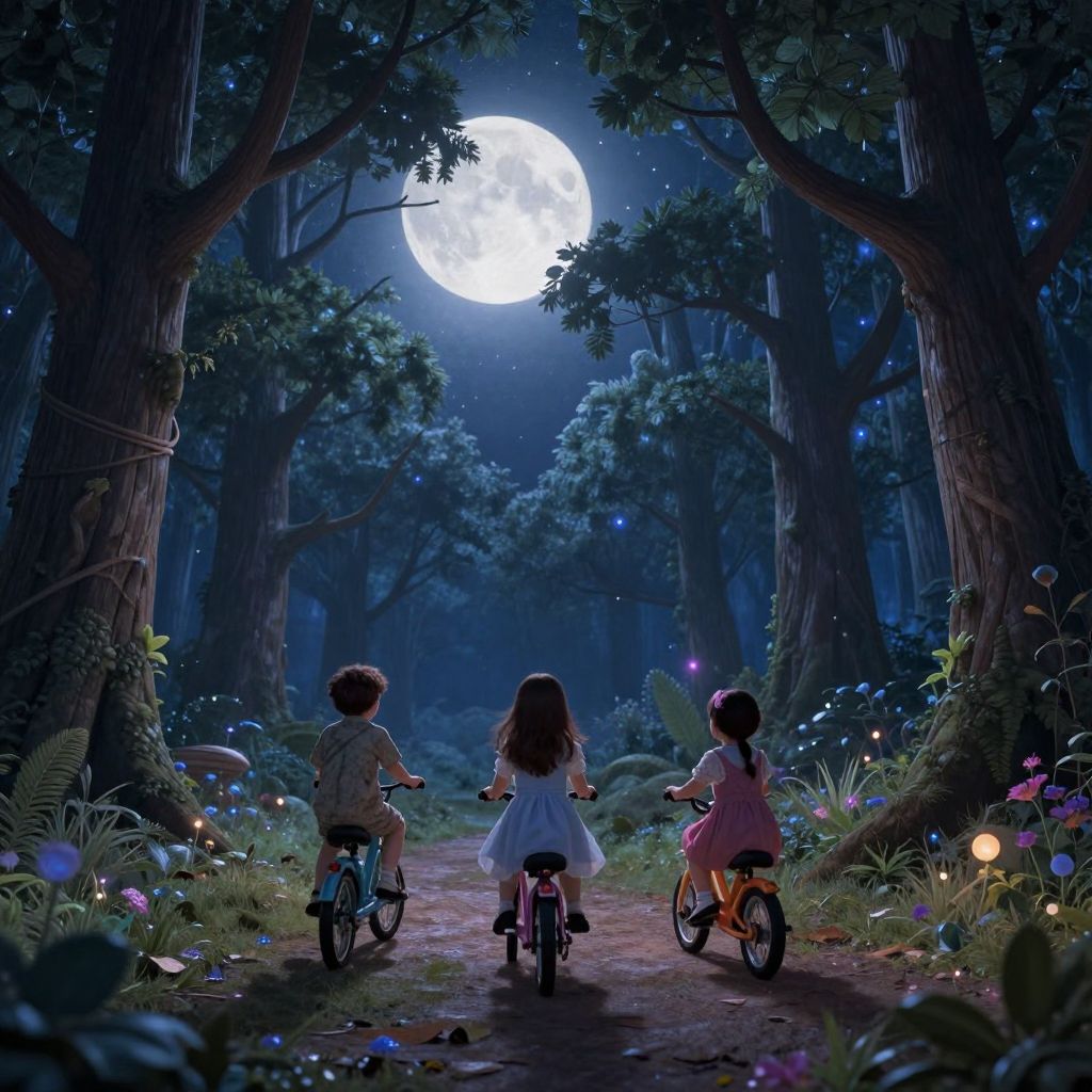 Under the watchful gaze of a luminous moon, children ride through a enchanted forest where the whispers of night merge with the celestial symphony of singing trees, embodying the boundless freedom and wonder of childhood dreams.
