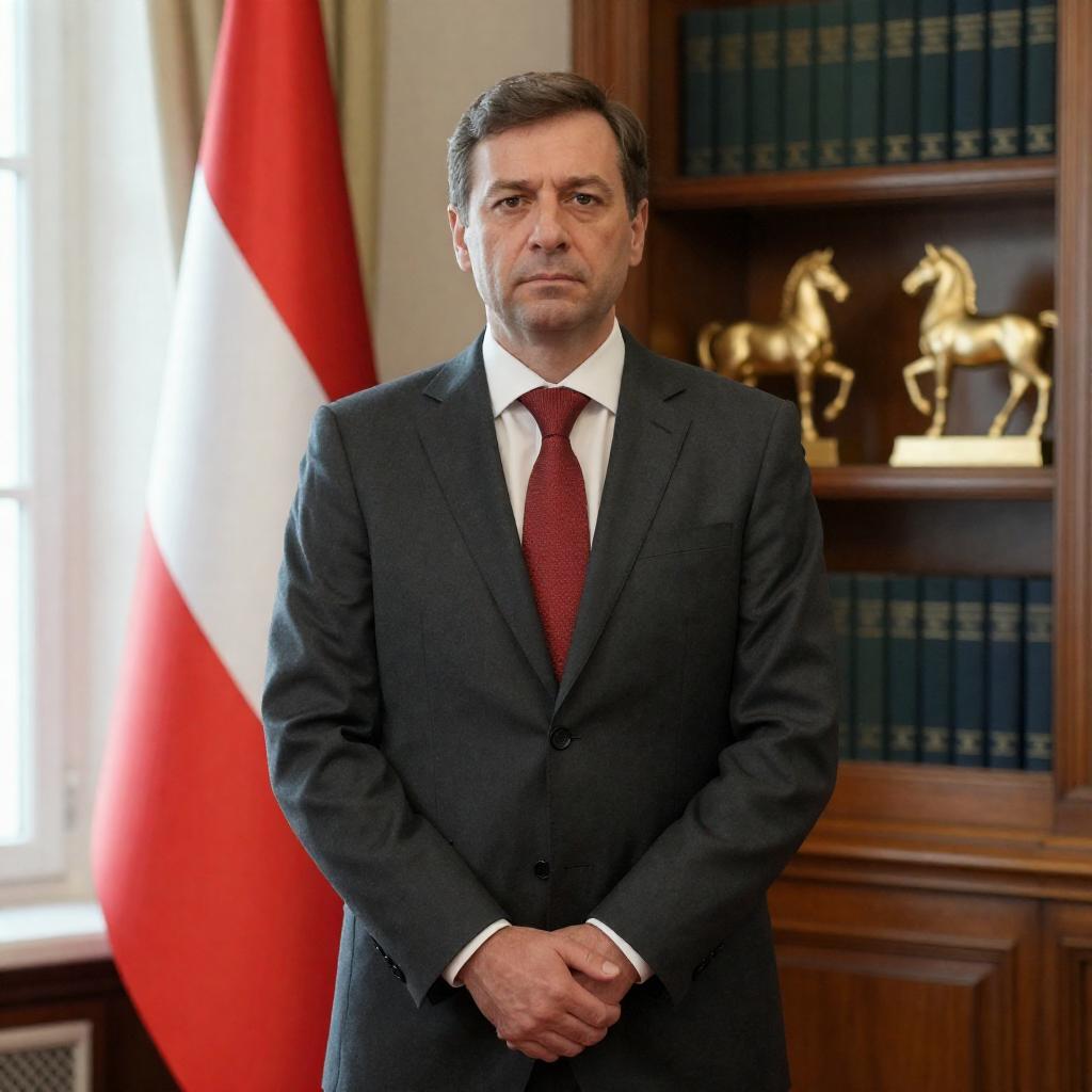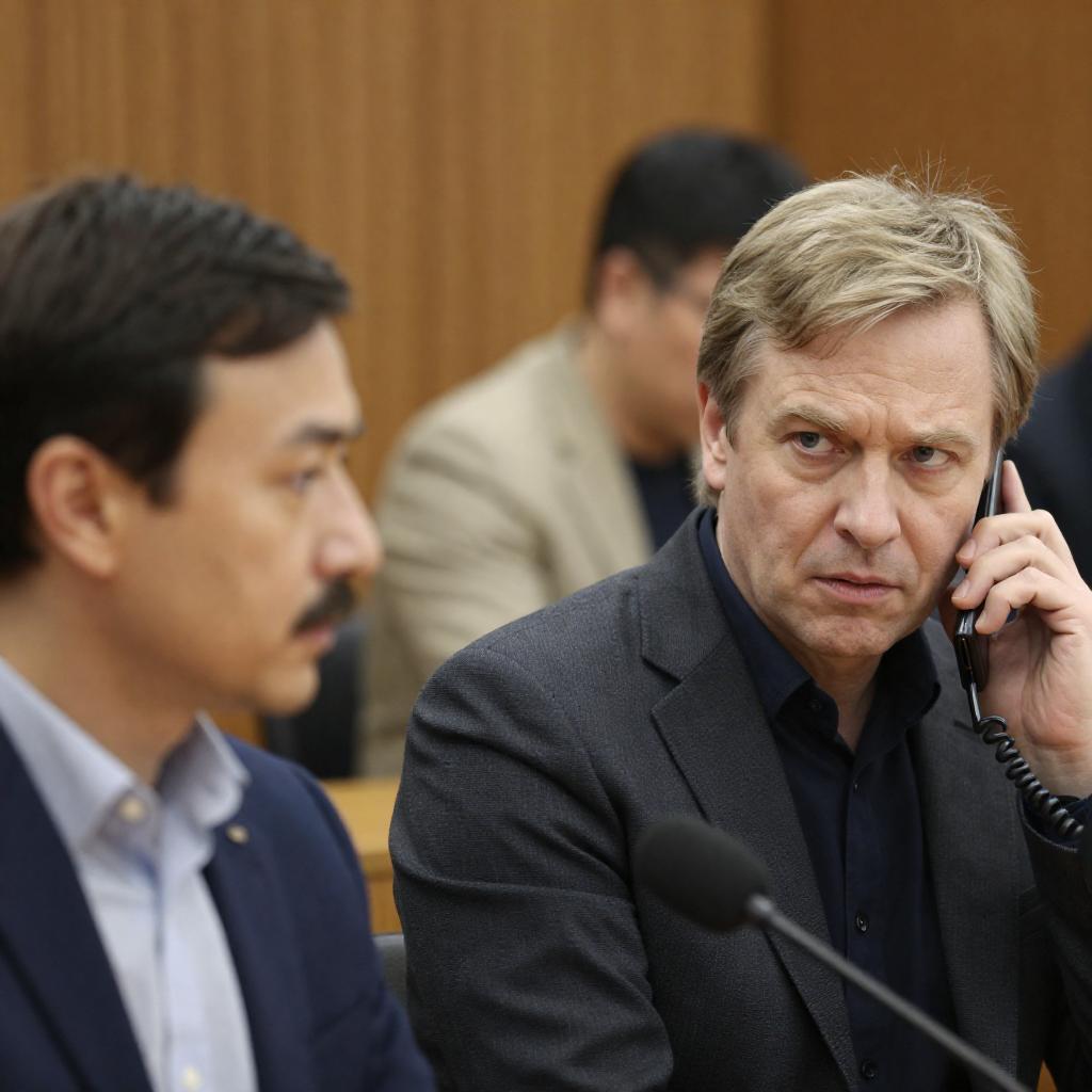 Photograph of two men in suits, standing outdoors. Foreground man, with blonde hair and blue tie, serious expression, right side. Background man, with brown hair, neutral expression, left side. Microphones with colorful attachments in front. Bare tree and pink building in background.