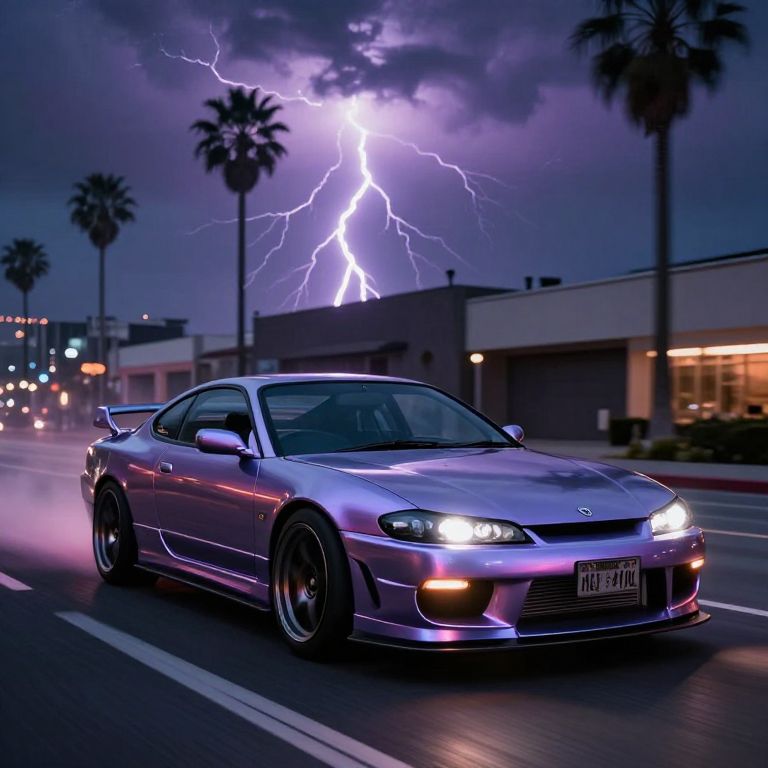 Metalness nissan silvia s15 driving through the streets of los angeles cyberpunk style in a lightning storm,