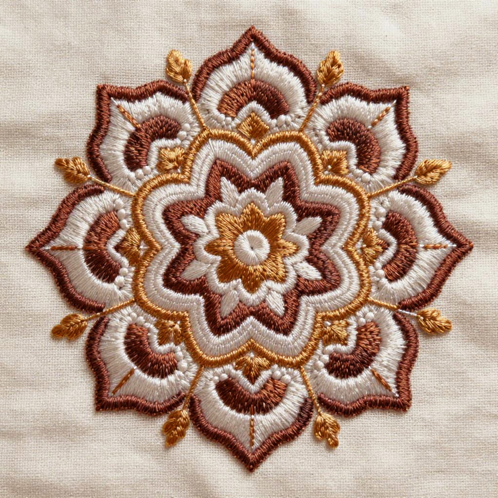 Embroidery effect online free, delicate hand-stitched floral mandala on rustic cotton, warm earthy tones, visible embroidery techniques, soft lighting emphasizing thread textures and layered stitches, digital art with traditional embroidery craftsmanship aesthetic.