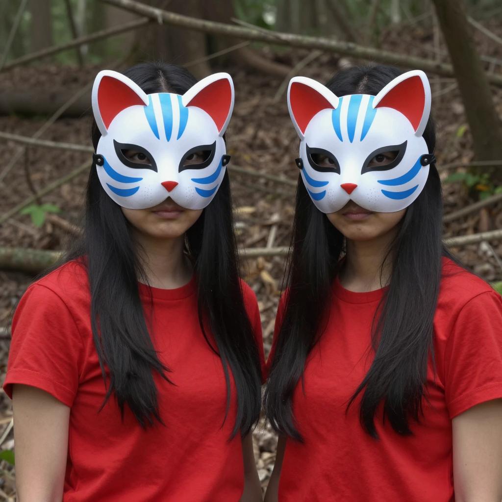 Three women standing on concrete stairs, wearing black school uniforms, black ankle socks, and black shoes. Each woman holds a white fox mask with red accents, covering their faces. They stand closely together, facing forward, with arms slightly bent at the elbows. Metal railings on either side, lush green foliage in the background.