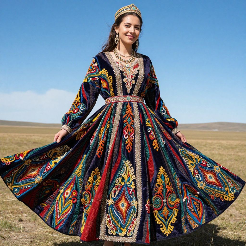 Kazakhstan costume, traditional vibrant patterns and intricate embroidery on flowing robes, set against a vast steppe landscape under a bright blue sky, detailed fabric textures