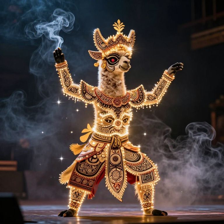 Alpaca cinematic, smoke, mysterious, magic glow, sparkle, shape of Javenese Srimpi dancer, Javanese shadow play Wayang, Javanese mythology, complex detail,