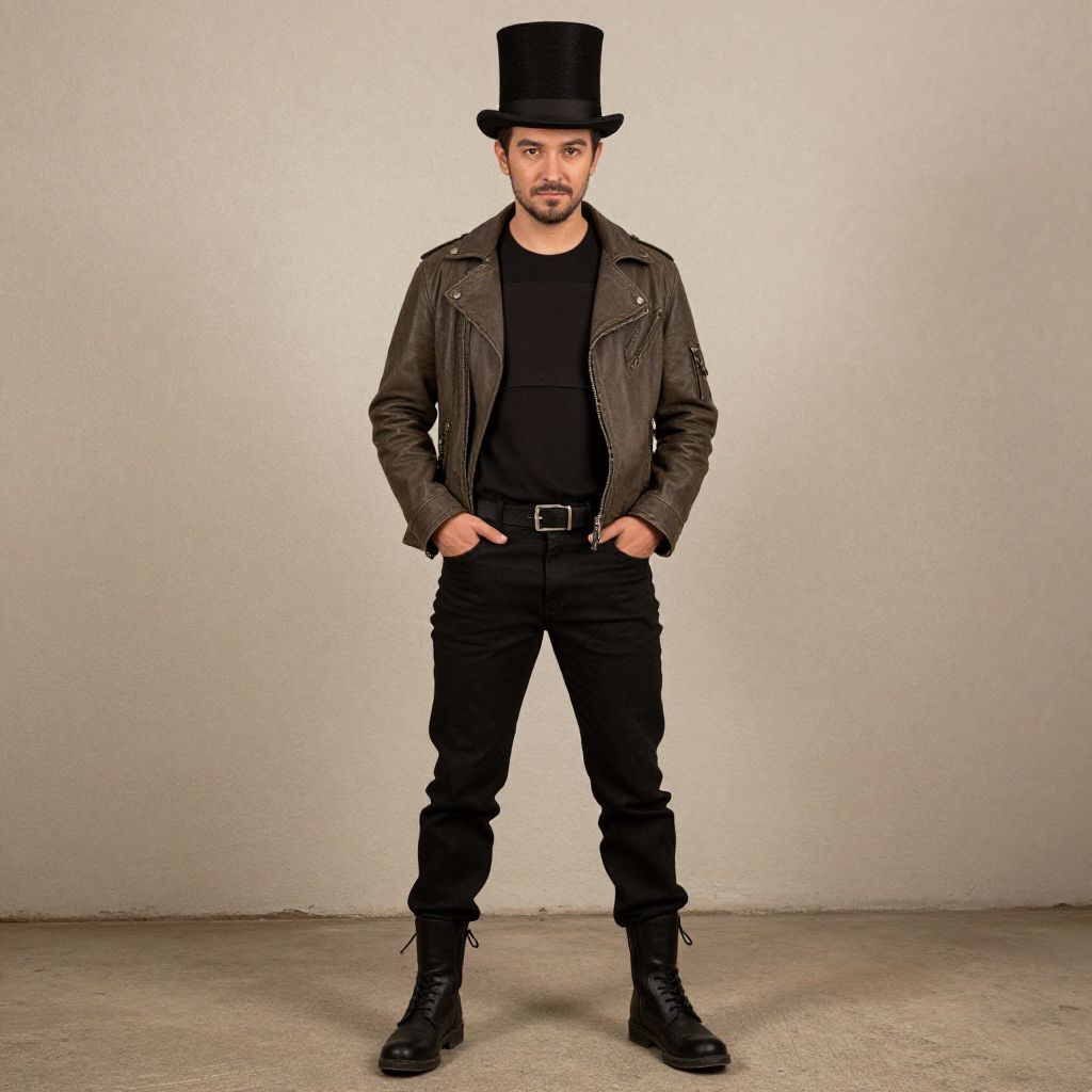 Photograph of a bearded man standing confidently against a plain, light-gray background. He wears a black top hat, a dark brown leather jacket over a black t-shirt, black pants with a belt, and black lace-up boots. His hands are casually placed in his pants pockets. The lighting is even, highlighting the textures of his clothing and the smoothness of the wall behind him. His expression is neutral, and he stands with a relaxed posture, exuding a stylish, slightly edgy appearance. The floor is concrete.