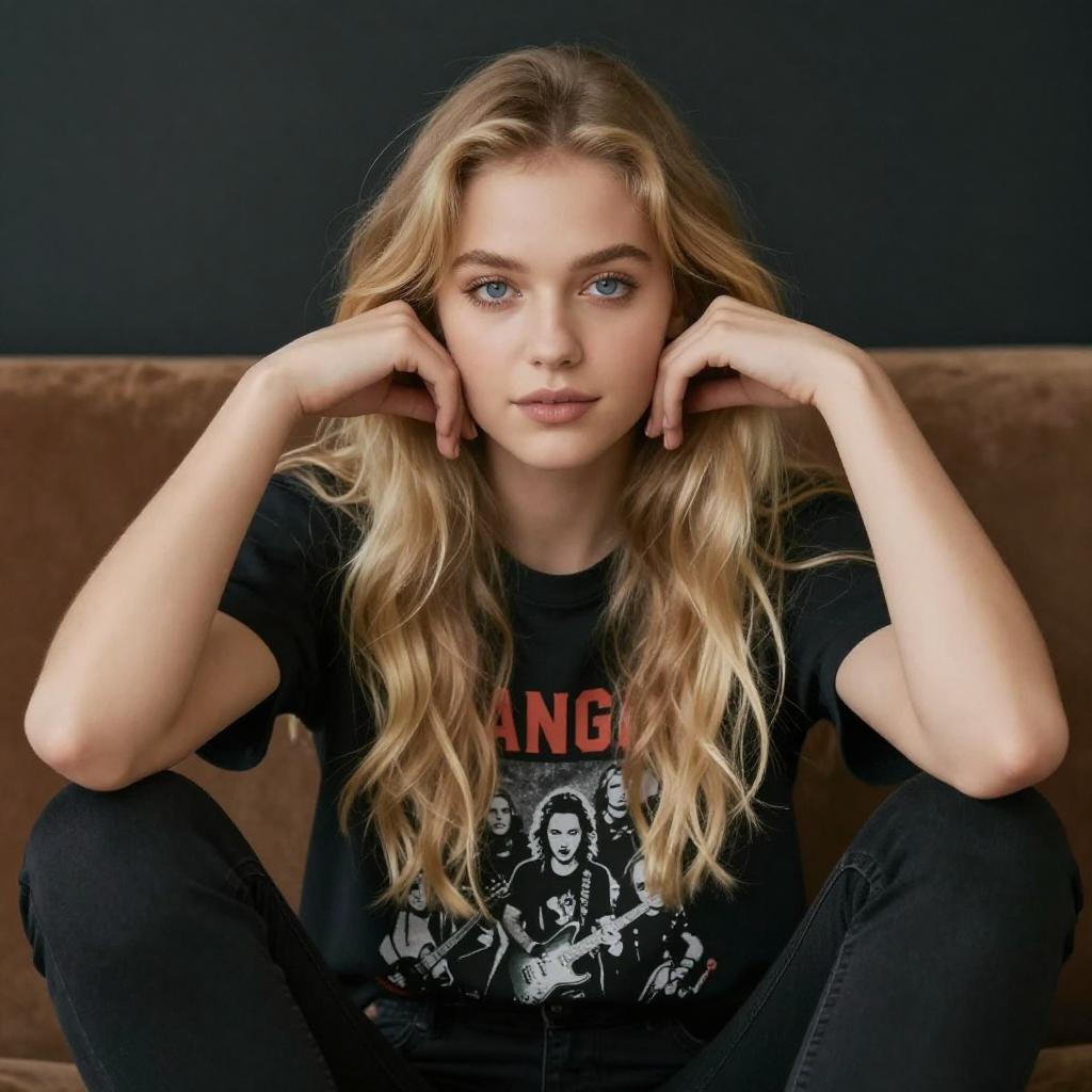 Photograph of a young woman with wavy, blonde hair and light skin, wearing a tie-dye shirt in shades of purple, white, and black. She holds a red electric guitar with a brown body, standing against a bright white background. Her expression is neutral, with slightly parted lips. The guitar's neck and frets are visible.