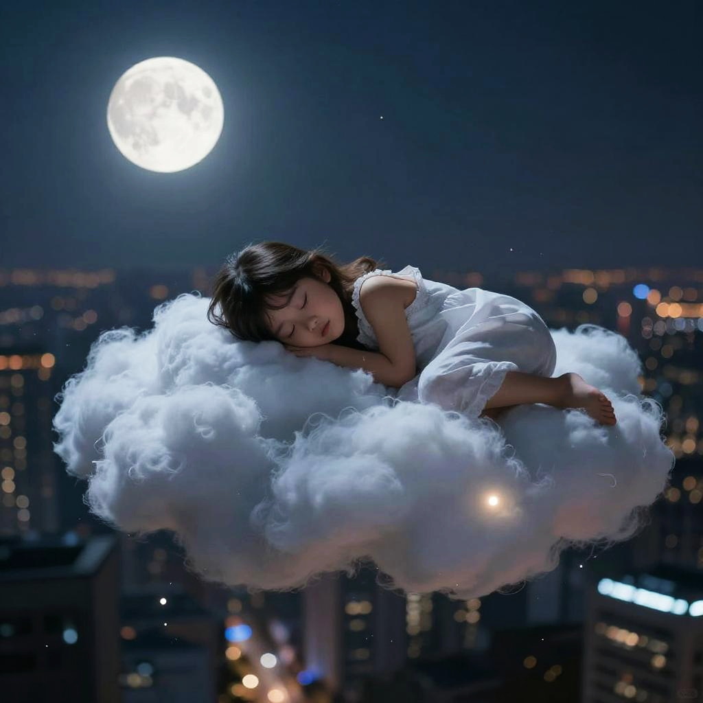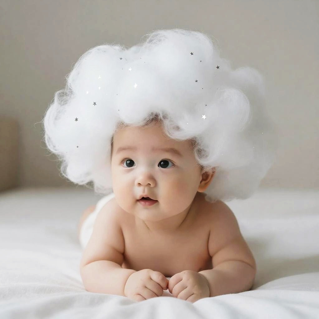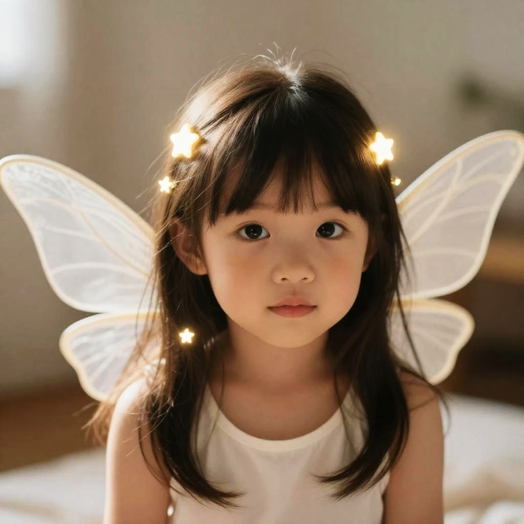Ultra-cute wistful moon owl child with silvery braided bangs threaded with tiny crescent clips, soft moonlight, and dreamy cozy vibes.