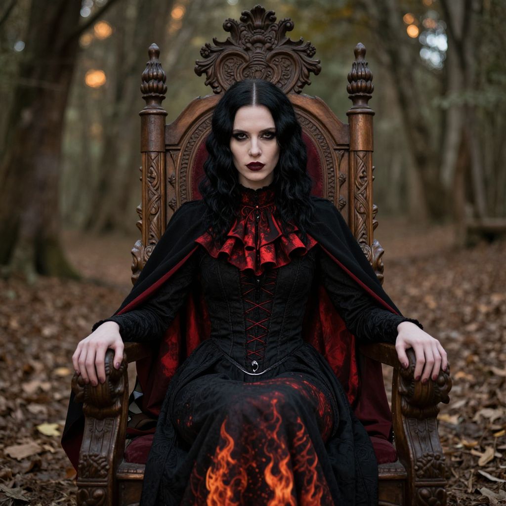Photograph of a pale-skinned woman with long, wavy black hair and dark red lipstick, sitting on an ornate, gothic wooden throne in a forest with fallen leaves. She wears a black, Victorian-style dress with a corset and a red, ruffled collar, and a black cape with red lining. Her dress has a flame pattern on the skirt. She has a stern expression, dark eye makeup, and her hands rest on the armrests of the throne. The background shows blurred trees and an autumnal forest. The overall mood is dark and mysterious.