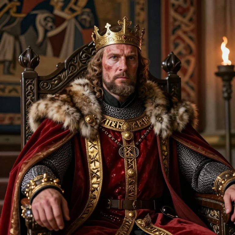 Photorealistic close-up of a medieval king wearing elaborate king fashion: a fur-lined cloak, rich crimson and gold armor plate, a royal mantle with golden runes, and intricate chainmail beneath; the king has a strong, noble face with a weathered complexion and deep-set eyes, sitting on a carved throne in a dimly lit royal hall with torches and tapestries depicting battles.