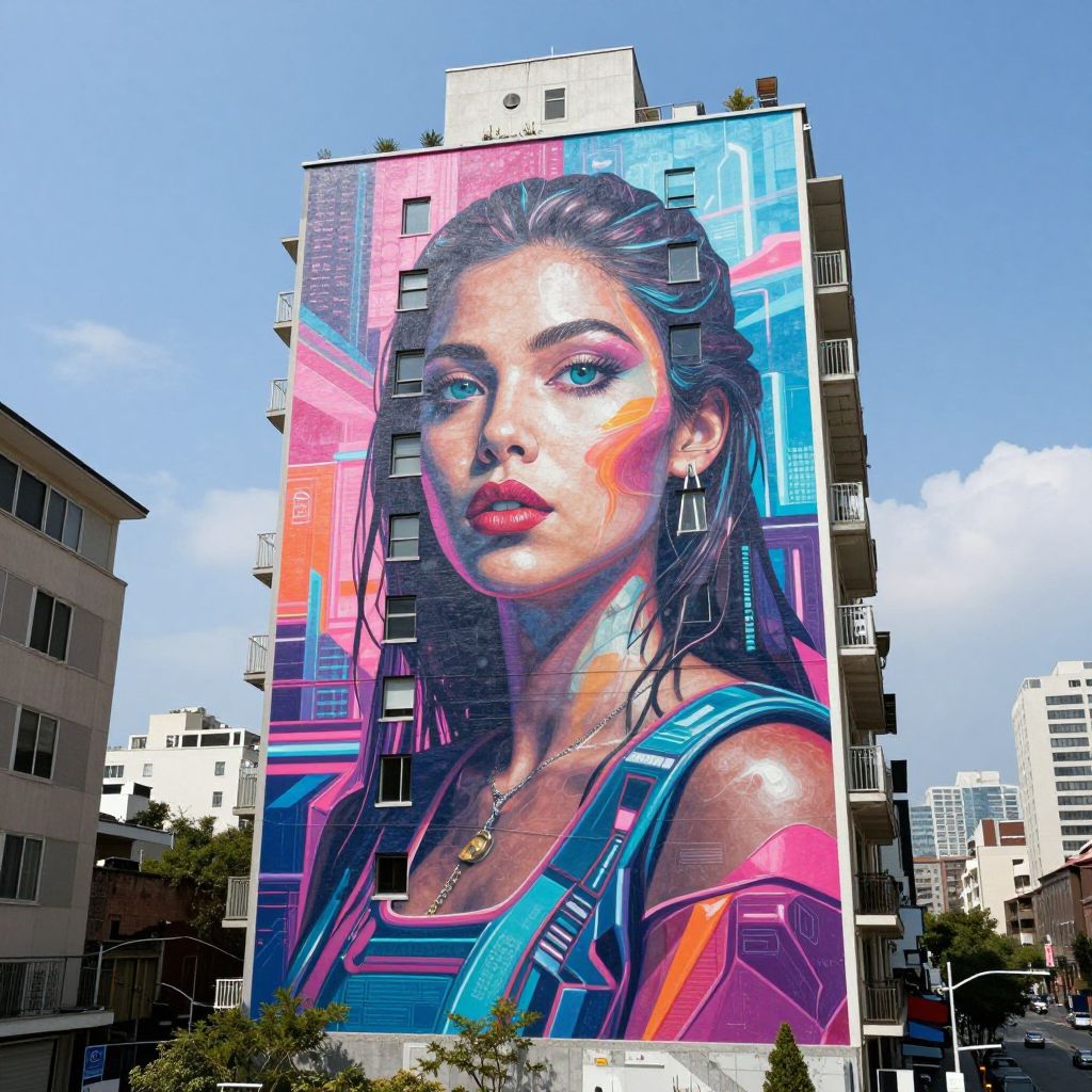 In a vibrant urban landscape, a towering building stands as a canvas for a colossal mural, its facade painted with a surreal portrait of a woman's face, blending seamlessly with the architectural lines and shifting hues to evoke a dreamlike, cyberpunk-inspired aesthetic that reflects the dynamic energy of the city below.