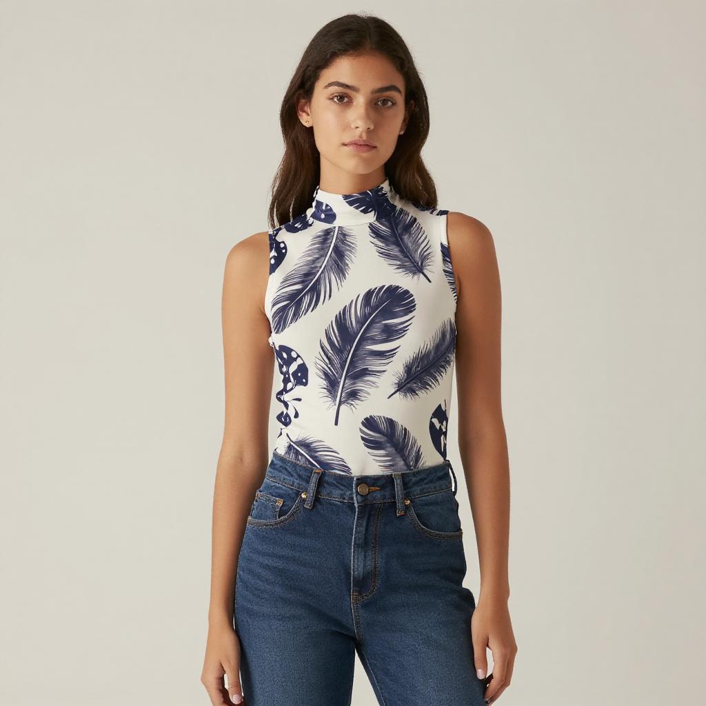 A young woman stands confidently against a plain backdrop, wearing a casual sleeveless high-neck top adorned with an abstract feather print in navy blue on a white base. Her dark hair complements the modern and minimalistic style of her outfit, paired with dark denim jeans for a chic yet casual look.