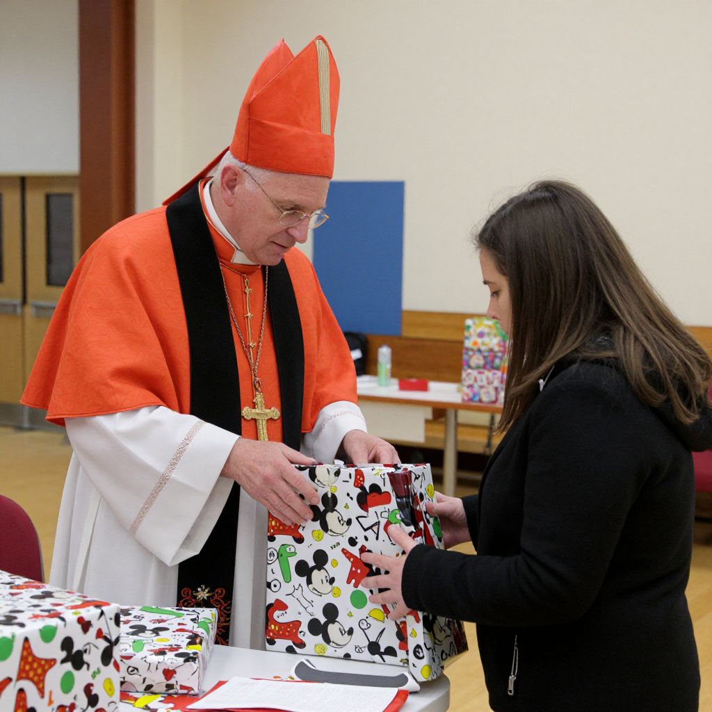 Cardinal O'Malley, wearing his traditional red zucchetto and black vestments, assists a woman in opening a gift wrapped in festive Mickey Mouse-themed paper during a Christmas gift distribution event at the Teen Center and St. Peter's in Dorchester on December 24, 2016, as part of a partnership with the Menino family and Catholic Charities of Boston.