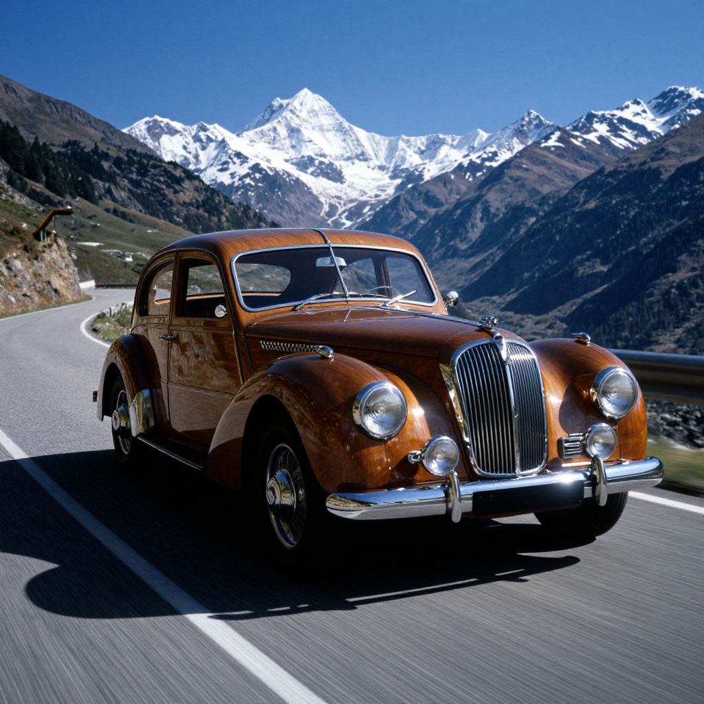 Vintage Riva car driving on a winding mountain road, clear blue sky and snow-capped peaks in the background, gleaming polished wood panels, classic retro styling, high contrast lighting with deep shadows and bright highlights, adventure and elegance theme
