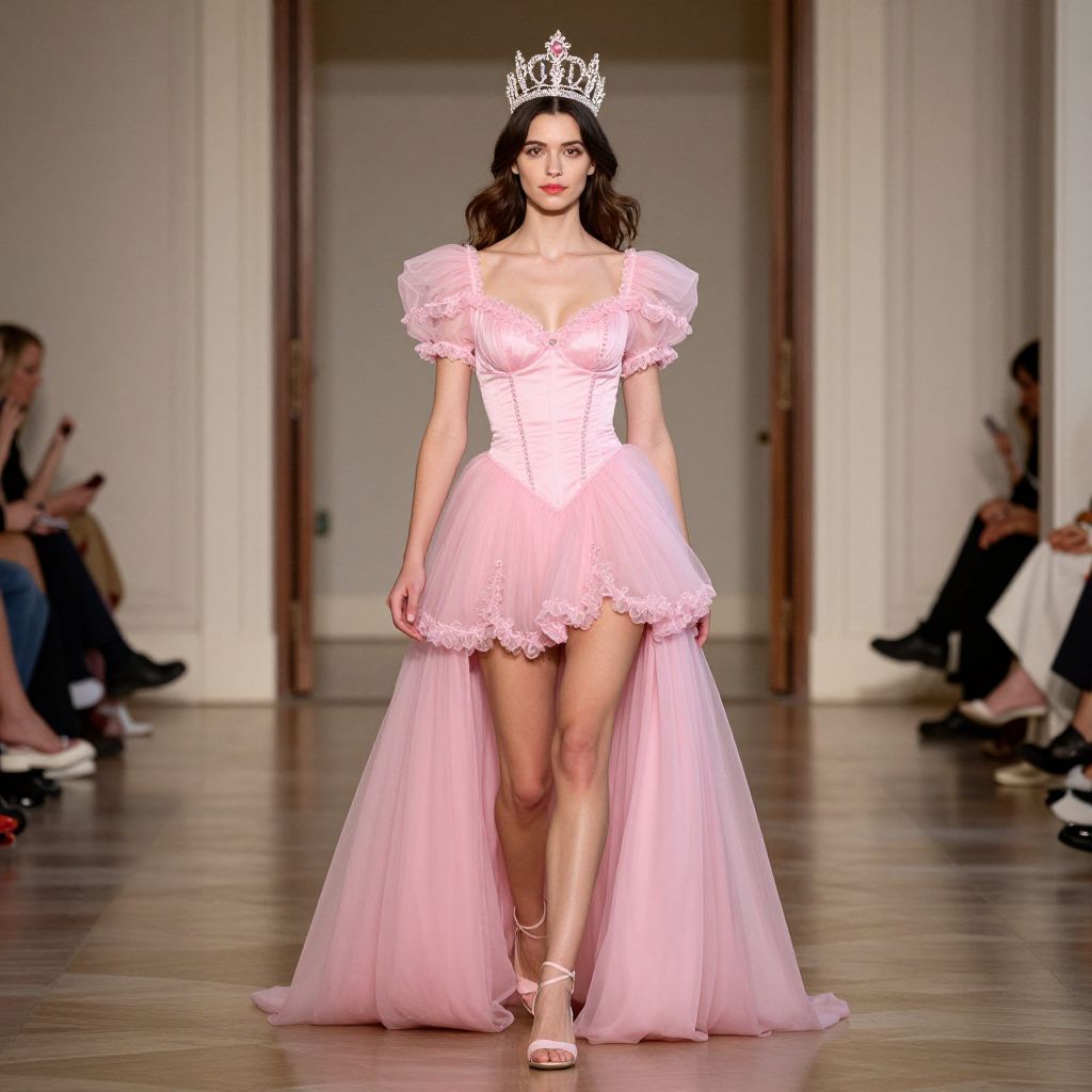 Photograph of a female model walking a fashion runway. She wears a pink, puffed-sleeve, ball gown with a lace-trimmed, sheer overlay and a long, flowing train. The dress has a deep V-neckline, accentuating her medium-sized breasts. She has dark, wavy hair and wears a silver, ornate tiara. Her skin is light, and she has a confident expression. She is also wearing white, strappy sandals. The background shows a minimalist, white-walled room with wooden doors and seated spectators on either side, blurred to focus on the model. The floor is polished wood.