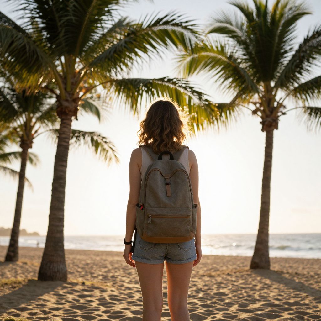 A woman with a backpack stands on a beach at sunset, surrounded by palm trees, with natural light and a 35mm lens effect.