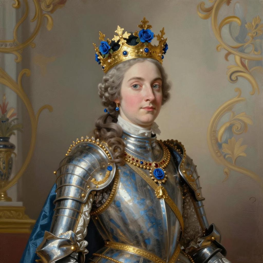 A regal woman wearing an elaborate golden crown adorned with blue roses, dressed in ornate blue and gold armor, standing against a softly textured background with classical baroque elegance, painterly brushstrokes and muted warm color tones, rich detail in fabric and jewelry, 18th century royal portrait style