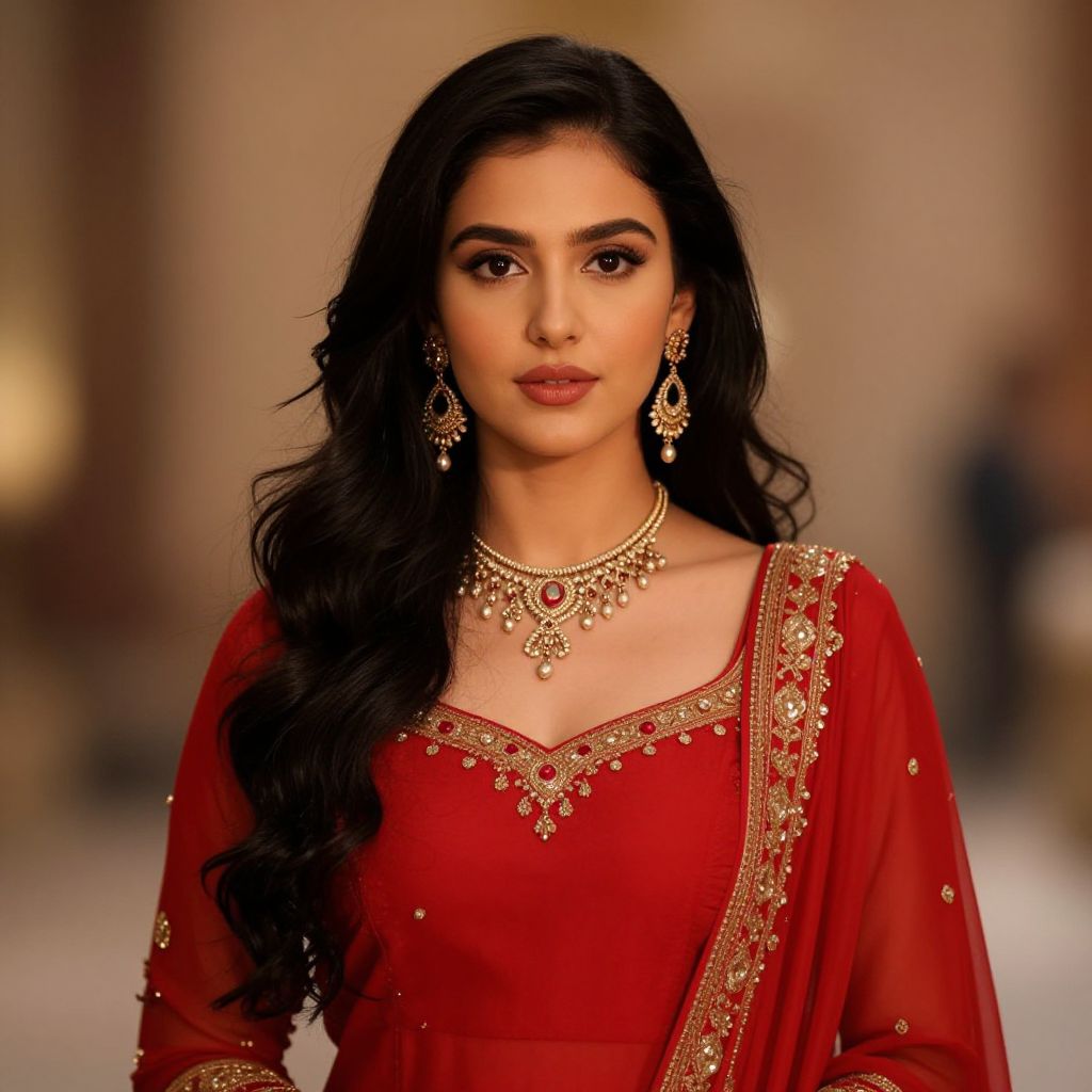 Jasmine aladdin red outfit, 1girl, solo, jewelry, earrings, necklace, black hair, realistic, long hair, blurry background, blurry, dress, looking at viewer