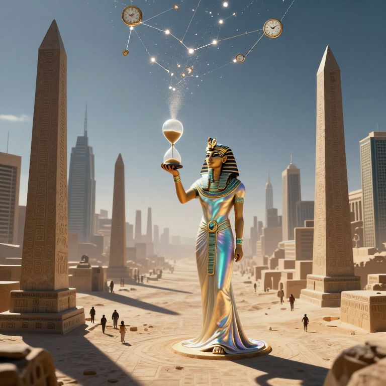 Envision an otherworldly digital artwork where elements from ancient Egyptian mythology intertwine with time-distorted cityscapes. Skyscrapers morph into towering obelisks, casting elongated shadows over the surreal landscape below. At the heart of this dreamlike metropolis stands a figure draped in shimmering, iridescent fabric that recalls pharaohs' robes. This enigmatic figure holds an hourglass filled with luminescent sand defying gravity, trickling upwards into the sky amidst a constellation of floating timepieces. The scene exudes bewilderment and intrigue as onlookers bear witness to this cryptic fusion of time and ancient mystery.