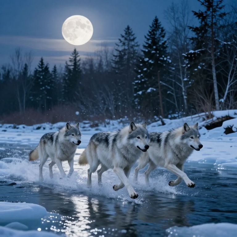 Silvery wolves gallop gracefully across a frozen river, their paws splashing through the shimmering ice as they race beneath a luminous full moon that casts a mystical glow over the snowy forest landscape.
