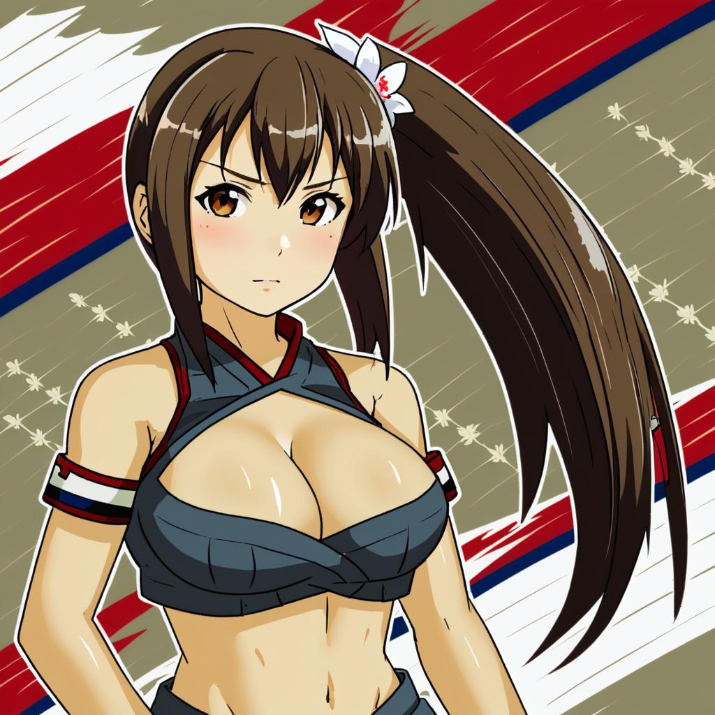 Amagi kai (kancolle), kantai collection, 1girl, brown eyes, hair between eyes, mole under eye, brown hair, long hair, ponytail, hair flower, large breasts, cleavage, cleavage cutout, navel, hip vent, bare shoulders, midriff, crop top, by artist jtveemo, anime