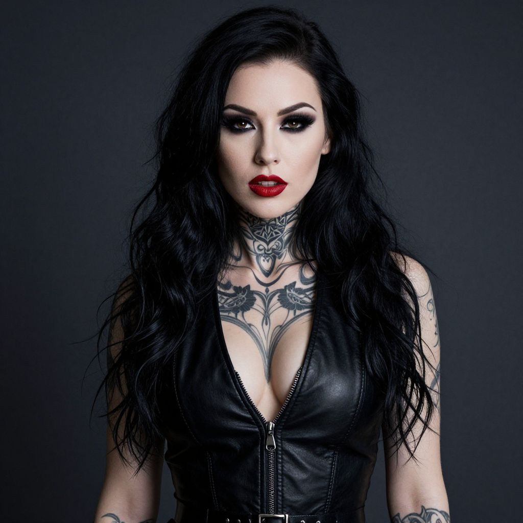 Photograph of a striking woman with long, wavy black hair and bold red lipstick. She's wearing a black leather vest with a deep neckline, showcasing intricate tattoos on her neck, chest, and arms. Her dark, smoky eye makeup contrasts with her pale skin. The background is a solid dark gray, making her stand out. She exudes a goth, edgy vibe.