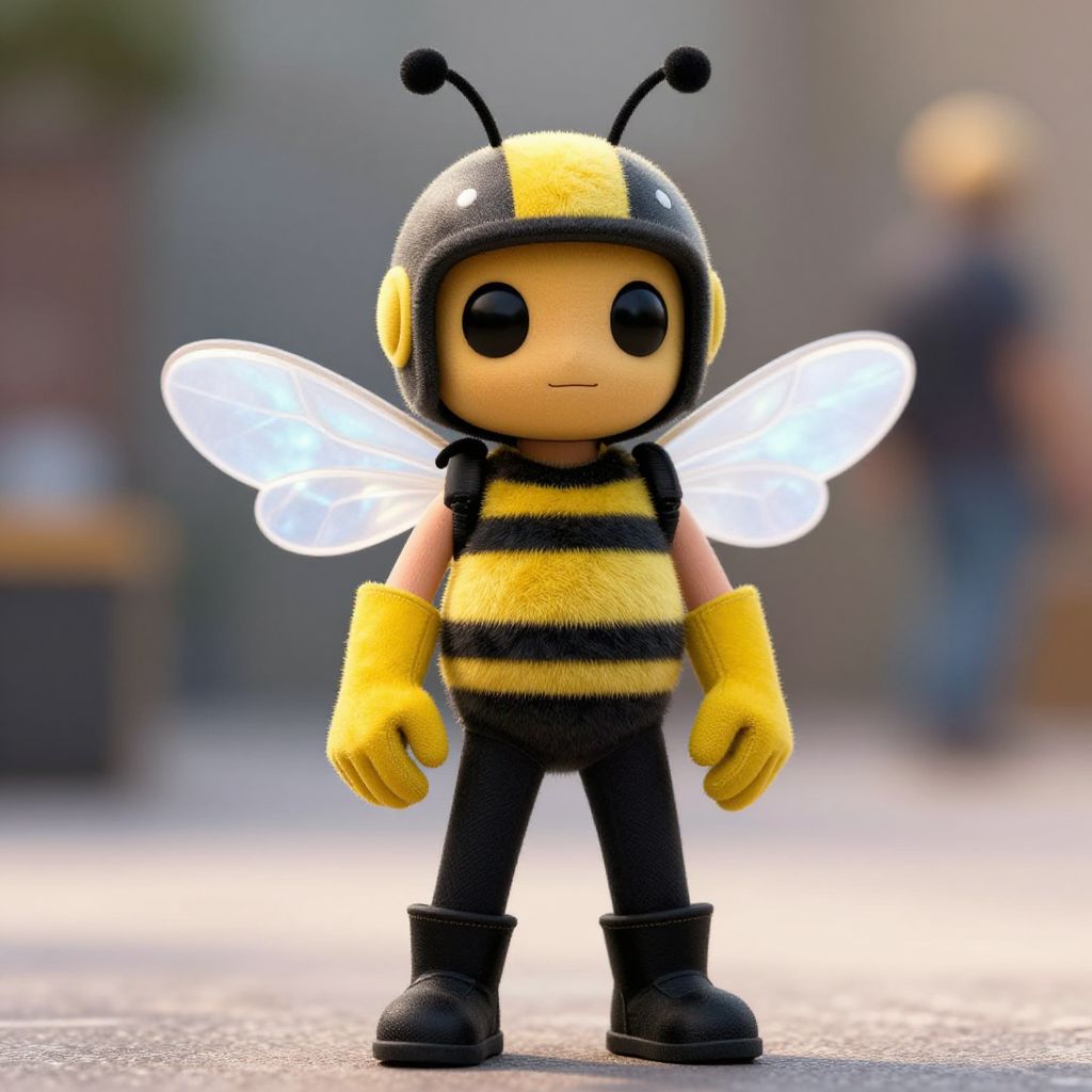 Photograph of a cute, plush-style figurine of a child-like bee character standing on a blurred outdoor street. The bee has a round face with large black eyes, a yellow and black striped fuzzy body, and yellow gloves. It wears a black and yellow bee helmet with antennae and black boots. The character has translucent white wings and a neutral expression. The background is out of focus, featuring indistinct people and buildings, highlighting the bee figure as the main subject. The image has a soft, toy-like aesthetic with vibrant colors.