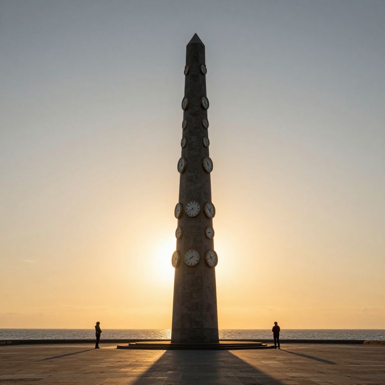 Towering obelisk constructed from cascading clocks stands solemnly against the horizon, its stone-like structure casting elongated shadows as two figures observe it from opposite sides, one near the ocean's edge and the other bathed in the golden glow of the setting sun.