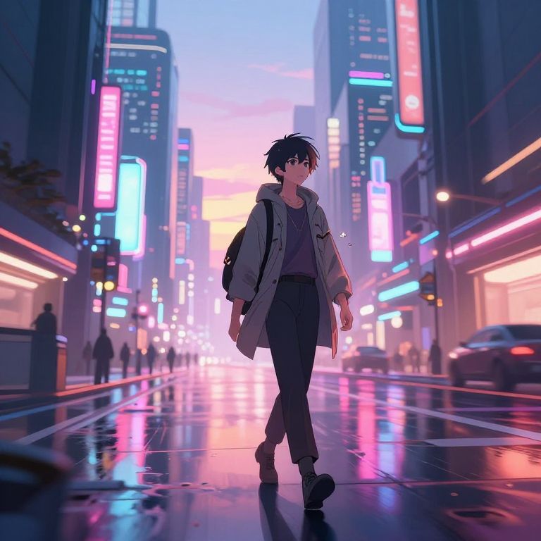 Anime diffusion style, vibrant futuristic cityscape at dusk, neon lights reflecting on wet streets, detailed character in modern attire walking, dynamic shading with soft color blending, high contrast shadows, cinematic atmosphere, ultra-detailed digital art.