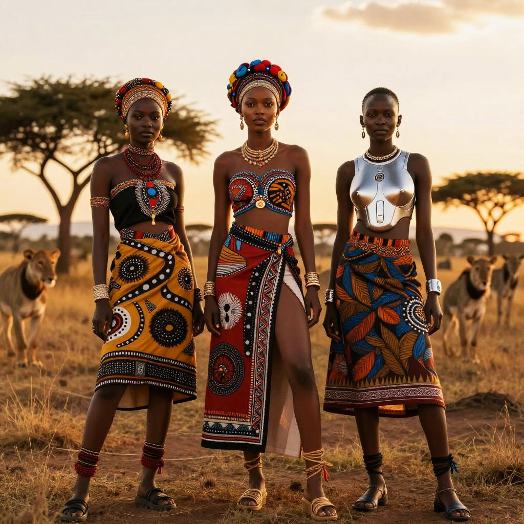 Daftari in a vibrant African savannah setting, showcasing a blend of traditional and futuristic attire, intricate tribal patterns, surrounded by majestic wildlife under a golden sunset, cinematic lighting, detailed textures, dynamic composition.