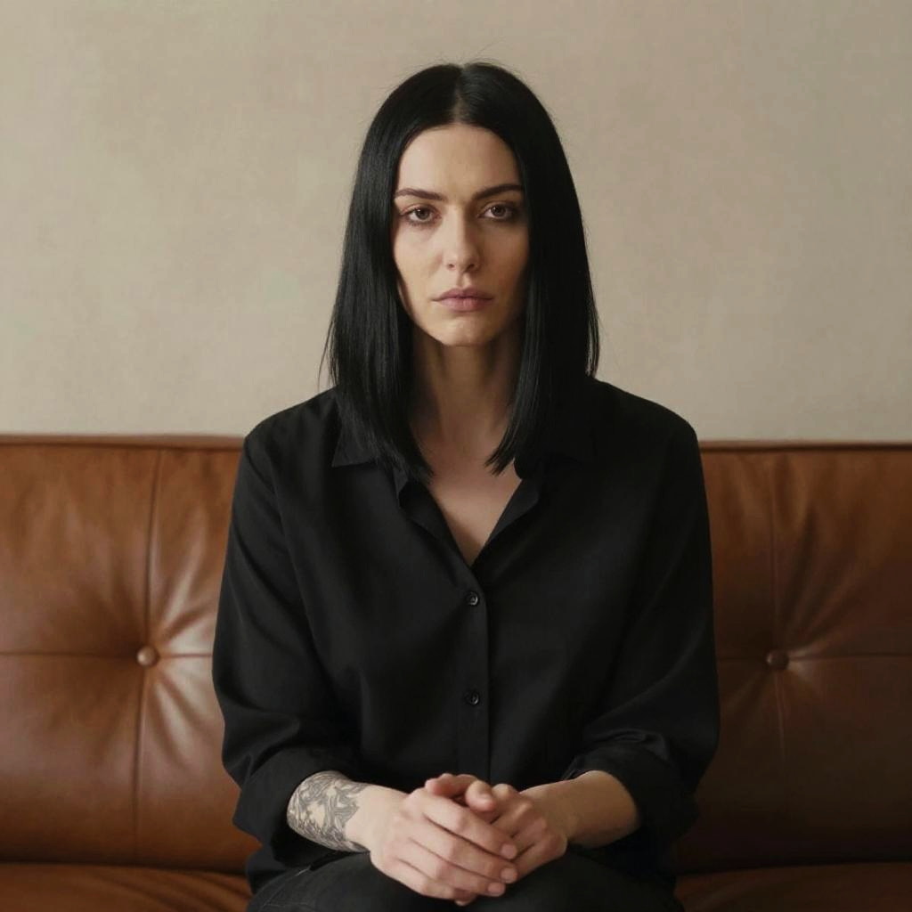 Photograph of a pale-skinned, dark-haired woman with wet hair, standing against a dark, gradient background. She is wrapped in a golden-brown, textured shawl that features subtle leaf patterns. Her expression is neutral, with slightly parted lips and focused eyes. The lighting is dramatic, highlighting her face and the shawl while casting shadows behind her. The overall mood is somber and introspective. The image has a high contrast and a studio-like quality.