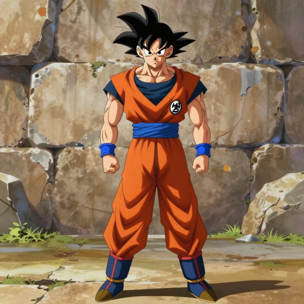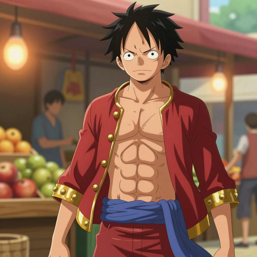 Luffy cosplay outfit, digital art, anime style, muscular male, black spiky hair, intense expression, red open shirt with gold trim, revealing toned abs, red pants with blue belt, standing in market, warm orange lighting, blurred background with fruits and stalls, hanging bulbs, detailed ures, vibrant colors, fantasy setting, character design, focus on male figure