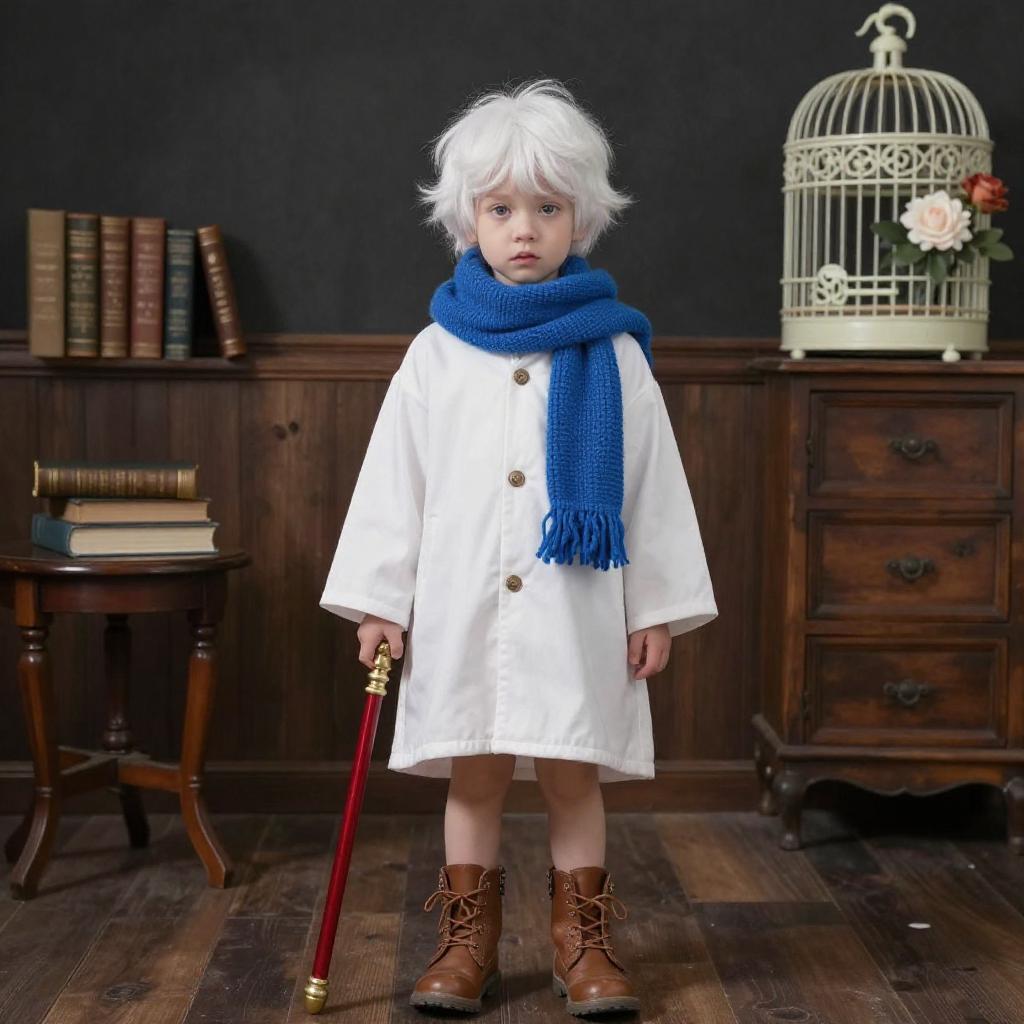 Photograph of a young child with white hair and pale skin, wearing a white coat, blue scarf, and brown boots, holding a red and gold staff. The child stands in a dimly lit room with dark wooden furniture, books, a small table, and a birdcage with flowers in the background.