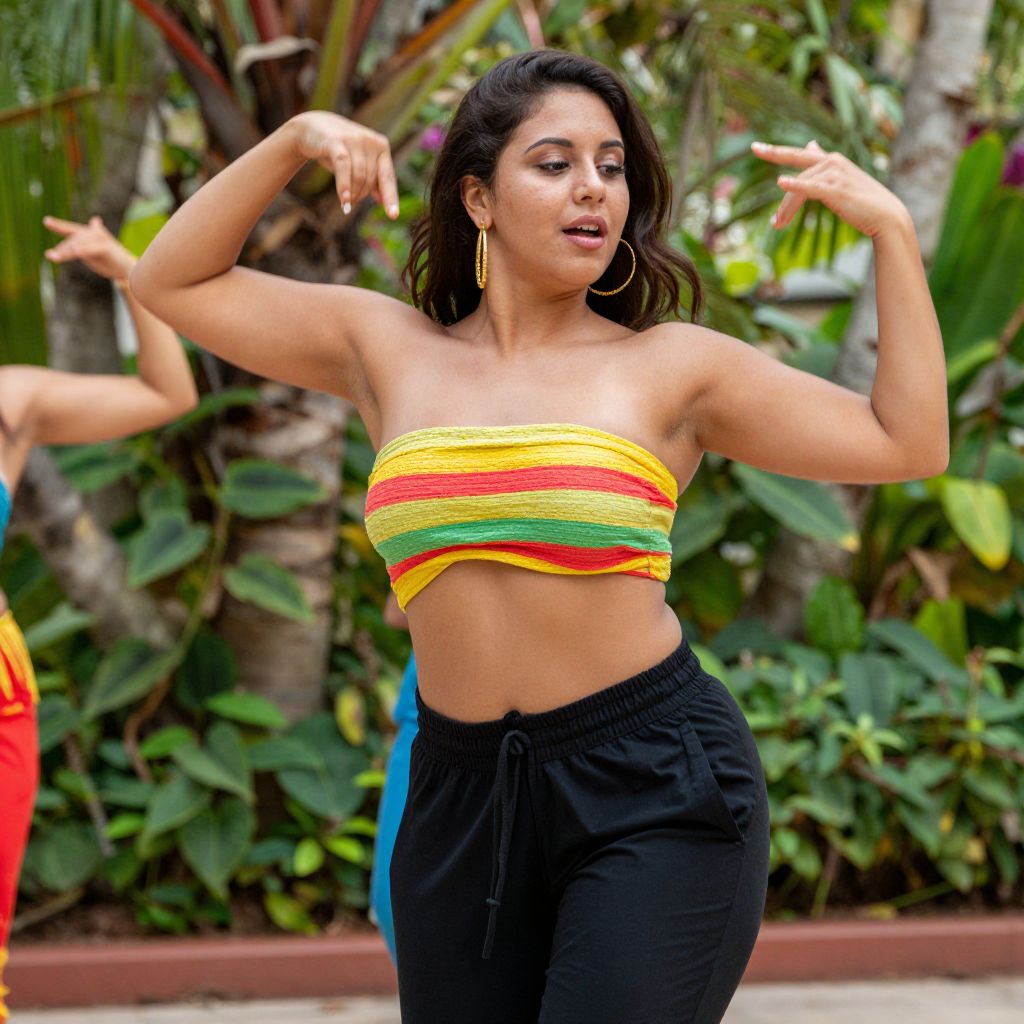 Photograph of a curvy Latina woman with medium skin tone, wearing a yellow-green-red striped tube top and black pants, dancing outdoors with lush green